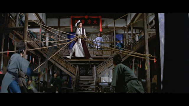 L’intrigue est assez jubilatoire à travers une suite de rebondissements où les traîtrises se multiplient à des dimensions rocambolesques, chaque clan dissimulant des agents dormants chez l’autre, et où l’ami ou le parent le plus proche peut s’avérer un ennemi ambitieux attendant son heure. Mieux vaut rester attentif sans quoi l’on sera vite perdu mais l’on n’est pas loin du film d’espionnage bariolé où chacun avance ses pions dans une redoutable partie d’échecs. Ku Feng dans le rôle de l’Oncle (et généralement spécialiste des rôles de méchants à la Shaw Brothers) est fabuleux en patriarche indestructible, humain mais qui exige néanmoins une soumission de tous les instants de ses acolytes. On salue ainsi son intelligence et sa capacité d’anticipation des pièges de ses ennemis, mais le clan et son chef passent toujours en premier telle qu’illustré dans cette scène cruelle où une famille l’ayant aidé à s’enfuir doit s’empoisonner pour être certaine de ne pas le livrer. Chu Yuan intègre donc habilement ce versant négatif de ce fascinant univers, notamment par la rédemption du tueur amoureux (et de son ancien frère d’armes pour qui l’amour fut une déchéance et un salut à la fois comme le souligne un échange) qui ne peut plus effectuer sa mission sans fléchir.