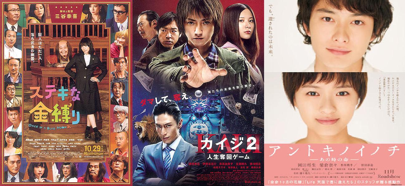 Malgré une perte de 26% de fréquentation, le plus gros succès vient de Once in a Blue Moon de Mitani Koki (The Magic Hour) avec son pitch délirant où une avocate, pour innocenter son client du meurtre de sa riche épouse, fait appel à son seul alibi : un fantôme d’un commandant de la période Sengoku vieux de 500 ans. Ce film remporte tous les succès : plus de 30 millions d’euros de recette en 6 semaines ! Doté aussi d’un casting prestigieux, on retrouve dans le rôle de l’avocate, Fukatsu Eri (The Magic Hour, The Adventures of Super Monkey), dans le rôle du fantôme Nishida Toshiyuki (Space Battleship Yamato, Sukiyaki Western Django) face à l’impitoyable Abe Hiroshi (Still Walking, Chocolate). Kaiji 2 de Sato Toya (Kaiji) reste en 6ème place pour sa 5ème semaine avec une importante perte de 35% de spectateurs, tout comme Life Back Then (seulement 3 semaines) de Zeze Takahisa (Pandemic, Rush!). Ce sont les américains qui subissent les plus grosses chutes (Les 3 mousquetaires, Contagion et Les Immortels)