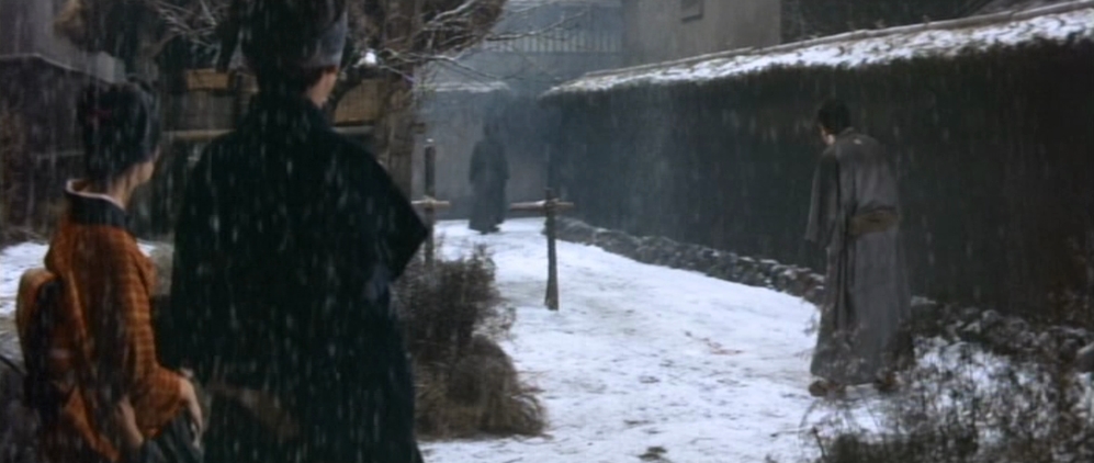 Ce qui entoure Zatoichi, les ombres désabusées qui vivent dans les paysages qu’il traverse, ne sont rien d’autre que les vestiges d’une époque sur le point de mourir. Les liens entre le personnage de Zatoichi et l’univers de Sergio Leone ne se retrouvent pas uniquement à travers la violence maniérée qui les habitent tous les deux. Plus encore que l’imagerie du duel climax, présent chez l’italien comme chez le japonais, se trouve dans le contre-champ du personnage du masseur aveugle ou du cow-boy sans nom, une fin du monde. Les rails posés dans le désert américain voient une certaine vie mourir à la fin d’Il était une fois dans l’Ouest (1968). Les samouraïs sans maître, les hommes sans cause qui hantent les cadres de Zatoichi eux, ont également un pied dans le passé : avec comme décors l’autorité shogunale déchue, les gangs pullulent et toute une société est sur le point de s’écrouler. Zatoichi ne choisit pas réellement de défendre les faibles et les opprimés dès l’instant où il rentre dans une nouvelle ville mais ce sont eux qui viennent à lui naturellement. Comme ils se rattacheraient à une figure du passé ou au souvenir d’une vie meilleure, ils implorent son aide.