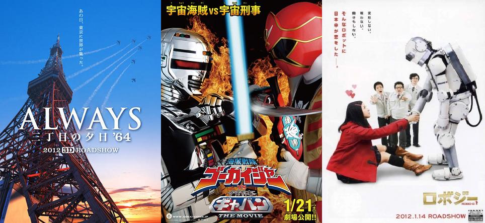 Le succès des deux précédents Always annonçait la couleur : c’est un joli filon ! Et Always San-Chome no Yuhi ’64 semble très bien parti lui aussi puisqu’il a attiré plus de 400 000 personnes durant le seul week-end, dépassant les chiffres du film précédent : Always zoku san-chôme no yûhi. Rappelons que ce deuxième film avait rapporté pratiquement 45 millions d’euros et qu’un résultat similaire est attendu pour ce dernier opus. Belle entrée aussi pour Kaizoku Sentai Gokaiger vs. Space Sheriff Gavan: The Movie avec 160 000 entrées, dépassant lui aussi le précédent film Tensou Sentai Goseiger vs. Shinkenger de 14%. Hélas, Robo-G chute en troisième position mais atteint quand même la barre des 500 millions de yens (4,9 millions d’euros).
