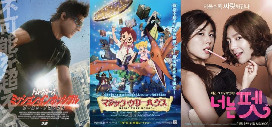 Mission Impossible: Ghost Protocol perd encore deux places mais accumule les 5 milliards de yens (49 millions) en seulement 6 semaines d’exploitation. Magic Tree House perd encore une place et en sixième position, nous retrouvons une sortie de la semaine, le film coréen You’re My Pet (tiré du manga japonais Kimi wa Pet). En Corée du Sud, le film fut accueilli froidement et le bouche-à-oreille fit couler le film en moins de 5 semaines…