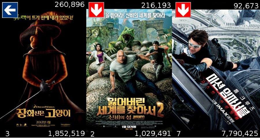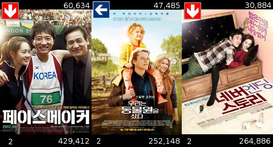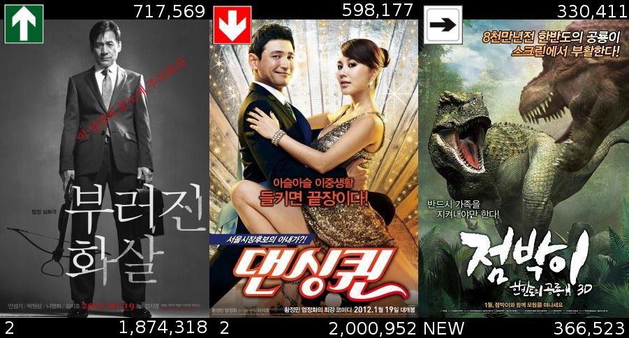 Les bottes du chat restent bien ancrées en quatrième place alors que Voyage au centre de la Terre 2 perd deux places cette semaine mais dépasse le million d’entrée. Ethan Hunt continue sa chute tout en espérant atteindre les 8 millions de spectateurs. Les autres sorties coréennes perdent aussi du terrain, Pacemaker perd une place et Never Ending Story en perd deux laissant Nouveau Départ (We bought a zoo) en 8ème position comme la semaine dernière.