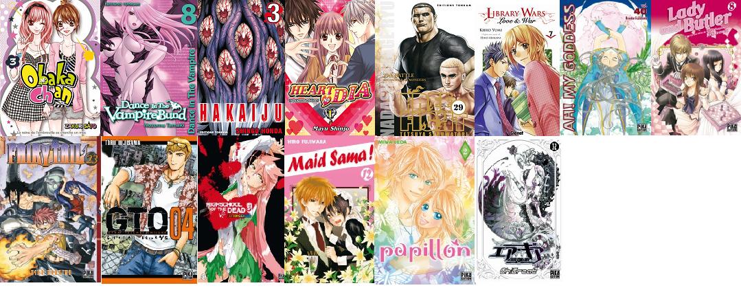 De l’éditeur Pika : Ah ! My Goddess : Tome 40, Lady and Butler : Tome 8, Fairy Tail : Tome 23, GTO, Shonan 14 Days : Tome 4, Highschool of the Dead (version couleur) : Tome 2, Maid Sama : Tome 12, Papillon : Tome 2 et Air Gear : Tome 32.