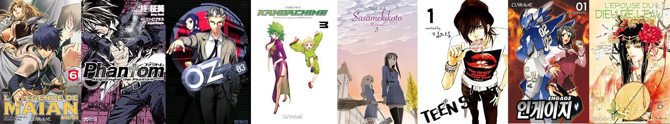De l’éditeur Clair de Lune : La légende de Maian : Tome 6, Phantom : Tome 3, Oz : Tome 3, Kandachime : Tome 3, Sasamekikoto : Tome 3, Teen Spirit : Tome 1, Engage : Tome 1 et L’épouse du dieu de l’eau : Tome 6.