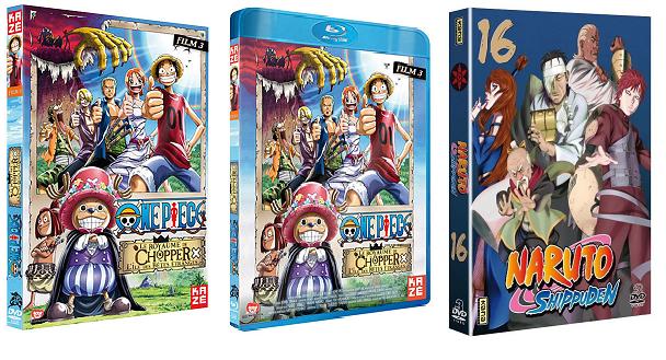 Kazé continue à sortir les One Piece. Après le premier film en août dernier, L’aventure de l’île de l’horloge en novembre et le numéro 10, Strong World (après une sortie cinéma pour celui-ci) en janvier, One Piece, le royaume de Chopper, troisième du nom, arrive en DVD et Blu-ray. Côté bonus, aucune information… Prévoir 16€ pour le DVD et 20€ pour le Blu-ray. Kana, de son côté, sort le dernier volume de Naruto Shippuden. Seizième volume et 12 nouveaux épisodes pour une grande guerre ninja qui se prépare… Prix conseillé : 40€