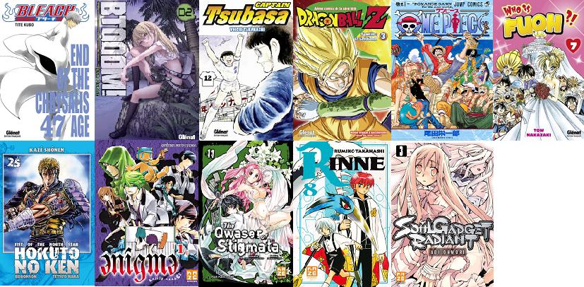 De l’éditeur Glénat : Bleach : Tome 47,  Btooom : Tome 2, Captain Tsubasa : Tome 12, Dragon Ball Z – Cycle 5 :  Tome 3, One piece : Tome 61 et Who is Fuoh ?! : Tome 7