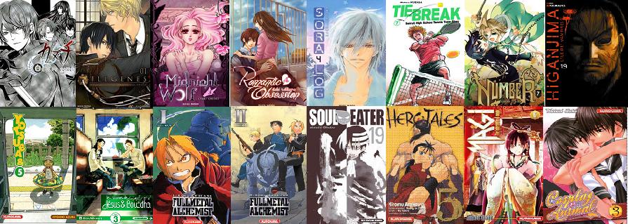 De l’éditeur Kurokawa : Yotsuba : Tome 5, Les vacances de Jésus et Bouddha : Tome 3, FullMetal Alchemist – TI (Vol.1-2-3), Fullmetal Alchemist – TII (Vol.4-5), Soul Eater : Tome 19, Hero Tales : Tome 5, Magi : Tome 6 et Cosplay Animal : Tome 3