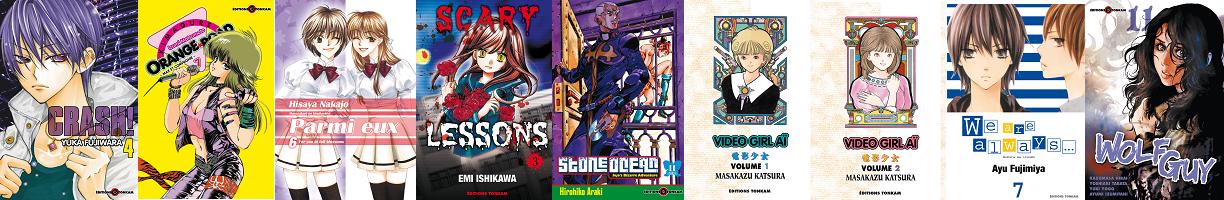 Aux éditions Tonkam : Crash : Tome 4, Kimagure Orange Road : Tome 7, Parmi Eux de luxe : Tome 6, Scary Lessons : Tome 3, Stone Ocean : Tome 11, Video Girl Aï : Tome 1 & 2, We are Always : Tome 7 et Wolf Guy : Tome 11