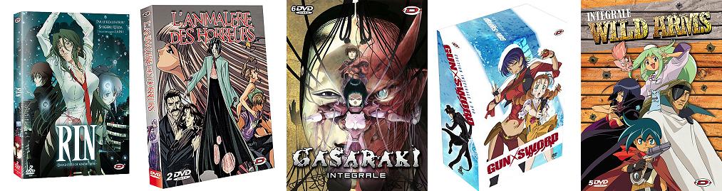 Une vrai déferlante chez Dybex mais il n’y a qu’une seule nouveauté : Rin, Daughters of Mnemosyne. Contenant 6 OAV de 45 min, on suit l’histoire de Rin, détective privée enquêtant pour un homme amnésique sur une étrange entreprise médicale. Contenant des scènes très gores et dénudées, il est certain que ce coffret n’est pas à mettre entre toutes les mains. Environ 30€ pour ce coffret. Passons ensuite aux diverses intégrales comme celle de L’animalerie des horreurs contenant les 4 OAV sur deux DVDs pour seulement 10€. Celle de Gasaraki contient les 25 épisodes sur 6 DVDs pour seulement 10€ tout comme Wild Arms et ces 22 épisodes sur 5 DVDs. Pour Gun x Sword, comptez 20€ par contre pour les 26 épisodes et 5 galettes.