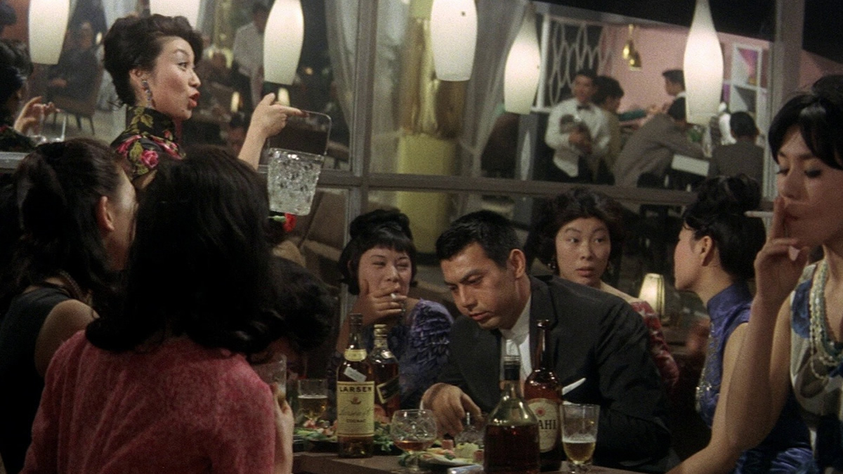 Pour ce faire il déploie une véritable maestria visuelle où le décor studio constitue un véritable outil pour pousser les situations à leur paroxysme dans sa mise en scène. On pense à cette confrontation dans le restaurant où un mouvement de caméra passe d’une vue en contre-plongée à travers un sol de verre pour le suivre ensuite en compagnie de deux sbires faire face aux pontes de l’organisation. Auparavant on aura apprécié dans le même décor la stylisation de ce mur de plexiglass insonorisant la salle de restaurant et celle de réunion des malfrats. Suzuki semble vouloir établir une vraie distance entre le monde réel et celui des yakuzas, que ce soit l’image plongée dans l’obscurité quand Shishido va à leur rencontre ou bien sûr l’ouverture en noir et blanc (si ce n’est deux fleur coloré dans un effet d’une grande poésie) quand on découvre le cadavre du policier. Le panache du héros est progressivement mis à mal, tout le côté classieux et omniscient du précédent film s’estompant. Jouant un double jeu à la façon du Yojimbo (1961) de Kurosawa Akira, sa couverture est plus d’une fois mis à mal. Cela s’incarne dans le récit au fil de la découverte de son passé, comme si en s’humanisant il en devenait plus vulnérable au contraire de Détective 2-3. Dès lors les effets tapageurs de Suzuki serviront à illustrer son chemin de croix plutôt que son triomphe, tel ce passage à tabac dans une pièce plongée dans la pénombre si ce n’est un éclairage bariolé l’isolant au centre de cet espace.