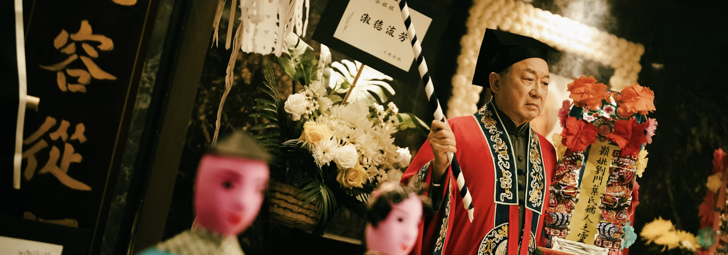 Ce qui ressemble au départ à une déclinaison hongkongaise du film japonais Departures, dans lequel un violoncelliste découvre les ficelles des métiers du funéraire, prend très vite une direction différente, et bien plus complexe que le simple clivage tradition et modernité. Dans La Dernière valse, par un concours de circonstances financières post-COVID difficiles, un organisateur de mariages, Dominic (interprété par Dayo Wong), s’associe à un prête taoïste, Man (interprété par Michael Hui), pour conduire les rites mortuaires traditionnels. Le titre chinois du film, 破地獄, signifie « briser la porte de l’enfer », l’un des rituels les plus distinctifs du taoïsme cantonais. Il s’agit d’escorter les âmes des défunts jusqu’à leur jugement dernier, et les guider jusqu’au seuil de la réincarnation.