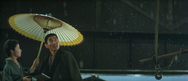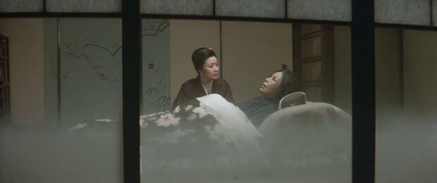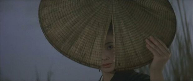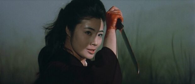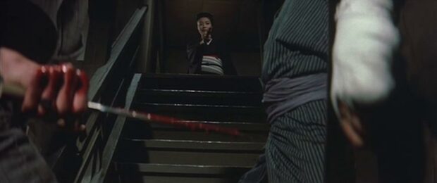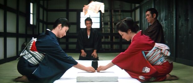 Le  11 février 1969, Oryu est déjà de retour dans le premier film d’une trilogie dans la saga réalisée par Kato Tai (grand réalisateur de studio et assistant-réalisateur de Rashomon…) : Le Jeu des fleurs (littéralement « la partie de hanafuda« ). Si ses films sont aujourd’hui parmi les mieux considérés de la série, ils ont apparemment été les plus compliqués à produire, l’actrice vedette trouvant le réalisateur trop lent sur le tournage et affirmant qu’elle ne comprenait rien à ses intentions. Pourtant, il faut bien constater que ce troisième épisode est particulièrement efficace. L’introduction du film abandonne la présentation sur fond rouge pour une scène in medias res, où l’héroïne, à la façon d’un Superman, sauve in extremis une petite fille aveugle du passage d’un train. De façon ludique, le laïus de présentation de l’héroïne constitue pourtant bien les vraies premières paroles du film mais sans le fond rouge et filmé de biais, comme dans un jeu de connivence avec le spectateur qui commence à le connaître par cœur… Cette fois, la formule est bien établie, ce qui permet au film de se concentrer sur sa mise en scène, avec des jeux sur les effets de cadrage et de surcadrage, une dramaturgie des regards et du rythme de la violence. Usurpation d’identité qui perturbe la scène d’hospitalité du début, conflits de loyauté, tournois de carte où il faut identifier le tricheur, le film joue parfaitement sa partition avec une vraie dimension ludique : le mélodrame lié aux « bêtises » de la nouvelle amie d’Oryu, le trouble de voir revenir Takakura dans le rôle d’un nouveau samouraï ténébreux, les scènes tire-larmes avec la petite fille aveugle qui ne veut pas être abandonnée et même la dernière séquence du film où la chanson de l’héroïne retrouve ses paroles pour illustrer le moment où la marche du couple sous le parasol se transforme en charge martiale avant le bain de sang final. C’est l’un des épisodes où la formule est la mieux mise en valeur.