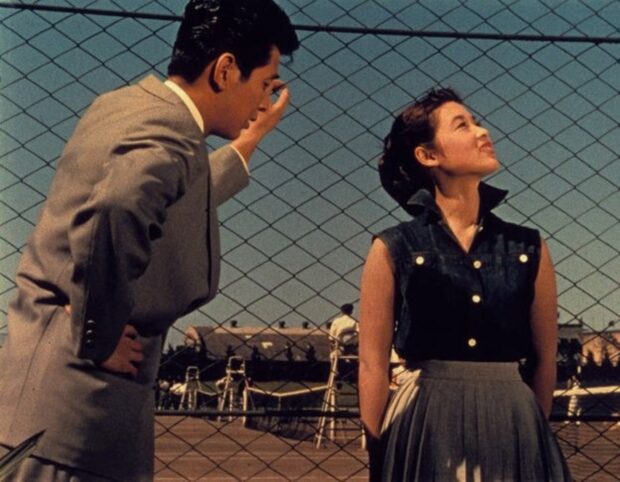 La principale qualité intrinsèque de Jeune fille sous le ciel bleu réside dans l’intelligence de son propos. On aurait pu craindre un focus trop important sur l’illustration du miracle économique japonais comme, finalement, cela est souvent le cas chez Ozu. Bien au contraire, Masumura (par l’intermédiaire de son scénariste Shirasaka Yoshio qui adapte un roman à succès de Genji Keita, alors faiseur de bestsellers en séries) fait de Yuko un vecteur d’une double émancipation, celle d’une femme, et celle d’une femme jeune. Il le fait manière tout à fait subtile, en la confrontant à son père, pourtant de prime abord sympathique et jovial. Le récit essaie en effet assez vite de trouver un croque-mitaine idéal en la personne de la belle-mère, avant de redistribuer les responsabilités de chacun des personnages. Véritable centre de son propre système solaire, Yuko va et vient dans ce Japon en plein bouleversement économique et sociétal – l’apparition dans une gare par laquelle arrive Yuko à Tokyo d’un homme gay rejoignant une amie avec des attributs vestimentaires marqués semble tout à fait avant-gardiste en 1957 – et ses réactions permettent aux personnages qu’elle fréquente, la famille de son père, la gouvernante, sa propre mère, son professeur ou le chéri de sa sœur d’évoluer eux-mêmes de manière marquée, le tout dans un positivisme à toute épreuve.