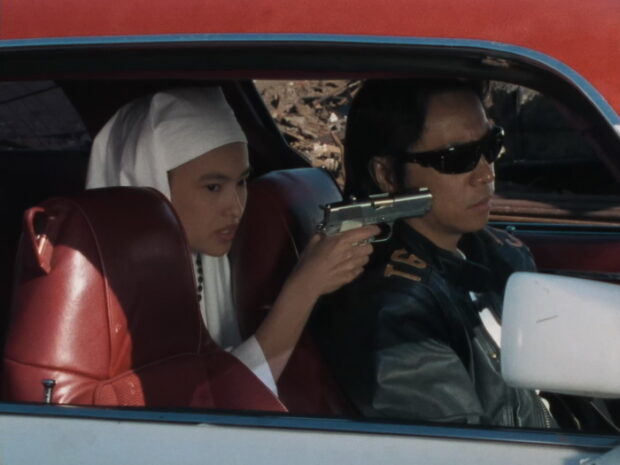De façon évidente, il ne s’agit pas d’un film qui brille par son scénario. Le contrat est simple : tout miser sur l’action et les rebondissements, en ne dépassant pas une heure de métrage (le film dure 58 minutes). Sera Masanori campe un policier vengeur au regard aussi fermé que son blouson de cuir est ajusté, taiseux, mais adapte des phrases chocs, et invincible lors des scènes d’action, un héros archétypal du cinéma d’action mondialisé de la fin des années 1980, en somme. À ses côtés, la jeune Tanaka Minako, en religieuse vengeresse (le fait qu’elle soit vraiment une religieuse semble parfaitement artificiel et sans vraie conséquence sur son personnage, mais offre quelques images très folles), permet d’échapper à un univers entièrement masculin, et cherche clairement à rivaliser en énergie avec son partenaire (le producteur affirme que l’un des buts du V-Cinema était de reviriliser la production nippone, les productions télévisuelle étant à ce moment tournées vers les héroïnes). Le reste du casting, composé de « gueules » affublées de noms anglais, est aussi très motivé, dans le même registre de bande dessinée au ton aussi sincère qu’hyperbolique. Le monde est caricatural, mais toujours respectueux du spectateur. On embrasse la folie des situations mais sans ironie et les personnages sont vraiment en danger, leurs exploits sont vraiment célébrés. Certains éléments ne vont finalement nulle part (l’addiction du héros à des antidouleurs destinés à le rendre aveugle) ou sont abordés avec une grande désinvolture (la révélation du traître et de ses motivations sont un grand moment de refus de construire des motivations complexes, en assumant que la réponse la plus évidente est la bonne) mais la présentation est tellement frontale qu’on l’accepte aisément.