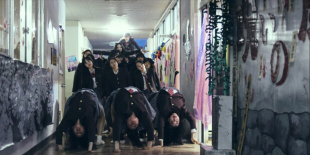 New Group est un film étrange au sens fort : il n’est pas seulement un énième représentant du cinéma japonais fou qui vient nous inonder de bizarreries ; il est surtout un film dont on ne sait pas véritablement par quel bout l’appréhender. Le cinéaste le conscientise d’ailleurs très explicitement en début de film en faisant dire à un de ses personnages, parlant des événements étranges se déroulant au Japon dans la diégèse du film, qu’il ne sait pas trop si c’est horrifique ou bien comique. Dans le cas de New Group, cela va même plus loin : on ne sait pas trop devant quel type d’objet l’on se trouve. Parfois, souvent en première partie de film, on a la fâcheuse impression d’être devant une mauvaise production type survival game à la mode, qui aurait pu être diffusée sur Netflix ou sur n’importe quelle chaîne en tant que drama adapté d’un roman / manga / jeu / webtoon à succès. Mais dans le même temps, des choix assez radicaux sont pris et la mise en scène parvient tout de même à se réveiller pour nous proposer, non plus une simple illustration molle (et sacrément laide) de son scénario, mais bien un contre-point détonnant. On pense en fait beaucoup à ce cinéma japonais de la période 90-2000 où des cinéastes talentueux versaient dans des objets typiquement industriels avec un résultat bâtard mais profondément passionnant (les films de Miike dans cette période par exemple ou plus précisément le Tag de Sono Sion pour ne citer qu’eux). Il en a en effet certaines caractéristiques (la Kadokawa comme studio et Kobayashi Tsuyoshi à la production) mais il semble dans le même temps être un projet très personnel, ce qui fait que les défauts ne sonnent plus vraiment comme des compromis mais comme des faiblesses d’écriture, de réalisation, et plus globalement de construction (ou alors comme des choix radicaux très mystérieux mais pas forcément réussis). Il y a donc cette ambiguïté profonde au cœur de New Group, qui est constamment entre l’éclat de génie et la production vite fait bien fait. Heureusement, cette ambiguïté n’est pas constamment à rebours de notre plaisir de visionnage.