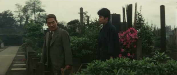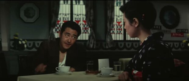 L’histoire de Hishakaku se conclut dans ce deuxième opus de manière classique mais fort belle. Sawashima et son scénariste Suzuki Naoyuki ne manquent pas d’user de la corde sensible pour nous faire ressentir toutes les qualités de l’écriture des films, y compris le premier, où se trouve la source de la construction des personnages. Cette facette sensible de l’intrigue a sans nul doute contribué au succès du ninkyo eiga, dont Theater of Life est un éminent représentant : les yakuzas dépeints sont avant tout des chevaliers qui répondent à un code d’honneur, pas les brutes épaisses qui suivront dans les films de guerre des gangs, les films dits d' »histoires vraies » de la décennie suivante. Ainsi, Tsuruta Koji, acteur impérial, compose toujours un yakuza guidé par l’amour et l’honneur, et la recherche d’Otoyo, après des errances pénitentiaires qui les ont éloignés durablement, une quête à la lisière de l’impossible mais vitale. Dans ce deuxième film, la mélancolie, le blues du yakuza, prend davantage le pas.