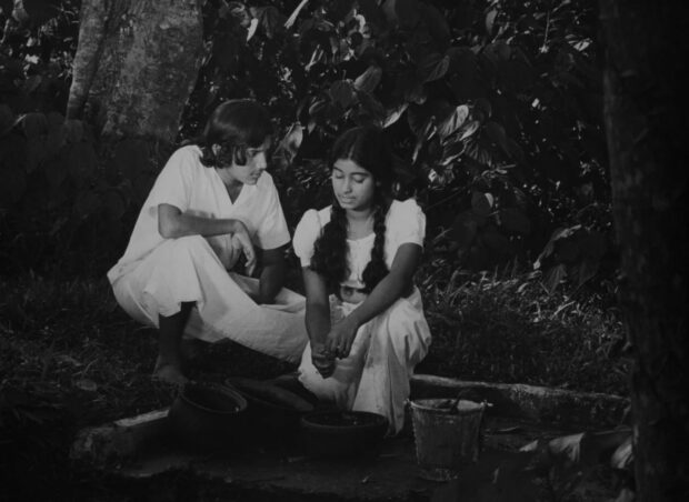 Les Filles (Gehenu lamai en singhalais) est adapté d’un roman éponyme de Karunasena Jayalath, dont un autre récit avait déjà été porté à l’écran par Lester James Peries dix ans plus tôt (Golu Hadawatha, ou The Silent Heart, 1969). Comme l’auteur, Sumitra Peries adopte le point de vue de Kusum, une adolescente réservée et bienveillante sur laquelle semble reposer tout le poids du monde. Issue d’un milieu rural modeste, elle prend soin de ses cadets, soigne son père malade et aide sa mère. Admise dans une prestigieuse école grâce à une bourse, elle étudie rigoureusement et tente d’ignorer le mépris que sa condition suscite chez certaines de ses camarades. Amoureuse de son riche ami d’enfance – et cousin éloigné – Nimal (Ajith Jinadasa), elle navigue doucement entre espoir d’union et cruauté sociale. Comme de nombreux (si ce n’est la quasi totalité) des films de l’âge d’or sri-lankais, le long-métrage débute par la fin. Kusum, jeune femme, étend du linge, le regard vide. Elle aperçoit au loin un cortège. Ses yeux croisent celui de l’homme dont le retour semble être célébré. Il s’agit de Nimal. Kusum replonge dans le passé.