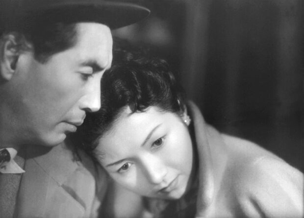 L’une des forces du récit est la sobriété propre à la mise en scène de Naruse, qui permet au jeu de Takamine Hideko (l’une des premières idols du pays, personnalité solaire réinventée par Naruse en tragédienne) et Mori Masayuki, aussi insaisissable ici que dans Rashomon (même si le film joue avec l’idée qu’il serait plutôt une incarnation moderne d’Iemon, ayant quitté Yotsuya pour Tokyo). Plutôt que des scènes de crises, le metteur en scène leur propose des scènes de dialogues moroses, ou chaque parole d’incompréhension agit comme un poignard. Le film joue sur le romanesque déçu ; le double suicide est avorté avant même d’être né, le meurtre est révélé par le journal, le vol est hors champ, tout est gâchis et intersection de solitudes. Et la musique nous emmène parfois vers des ailleurs possibles, que ce soit l’Internationale lors d’une manifestation avant que les personnages ne soient rappelés à leur misère, « Ce n’est qu’un au revoir » ou le thème nostalgique qui rappelle le Vietnam et l’illusion de l’amour perdu. Par moments, quand la douleur est trop forte, une analepse survient, une dernière fois lorsque l’héroïne s’éteint, alors que le geste final de l’amant montre qu’enfin il la regarde après un film entier à la fuir, mais trop tard, lorsqu’il n’y a plus rien à espérer. À tous égards, le film est un modèle du genre, parfaitement maîtrisé et implacable dans sa tragédie. Étrangement, on peut penser au Verlaine des Fêtes Galantes devant ce film, où « deux formes ont tout à l’heure passé », évoquant le souvenir défunt de leurs extases anciennes et le double suicide resté invitation contrariée : comme les indolents, nos mélancoliques se reprochent parfois d’avoir eu l’inexpiable tort d’ajourner une exquise mort…